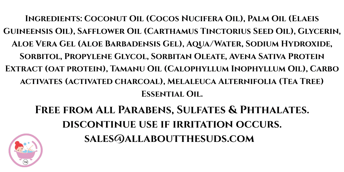 Ingredients: Coconut Oil (Cocos Nucifera Oil), Palm Oil (Elaeis Guineensis Oil), Safflower Oil (Carthamus Tinctorius Seed Oil), Glycerin, Aloe Vera Gel (Aloe Barbadensis Gel), Aqua/Water, Sodium Hydroxide, Sorbitol, Propylene Glycol, Sorbitan Oleate, Avena Sativa Protein Extract (oat protein), Tamanu Oil (Calophyllum Inophyllum Oil), Carbo activates (activated charcoal), Melaleuca Alternifolia (Tea Tree) Essential Oil.