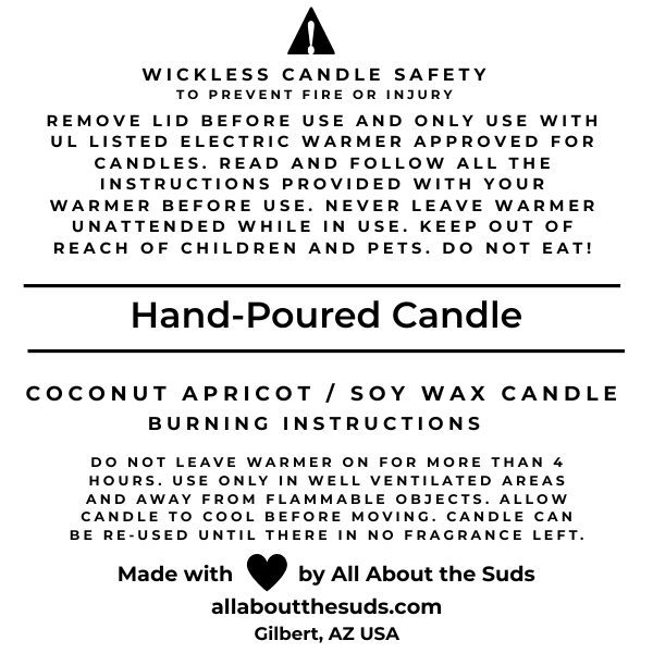 Remove lid before use and only use with UL Listed electric warmer approved for candles. Read and follow all the instructions provided with your warmer before use. Never leave warmer unattended while in use. Keep out of reach of children and pets. DO NOT EAT!